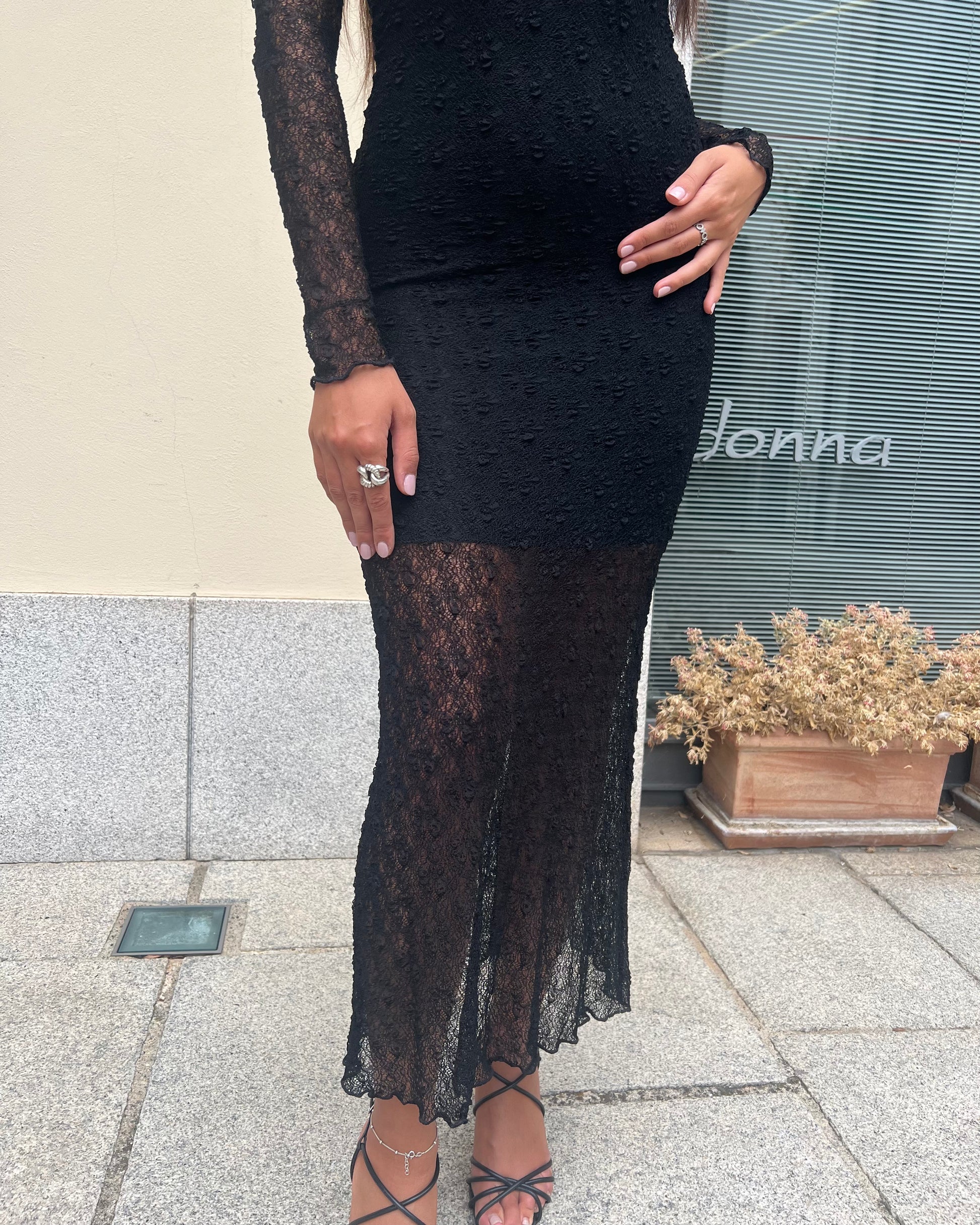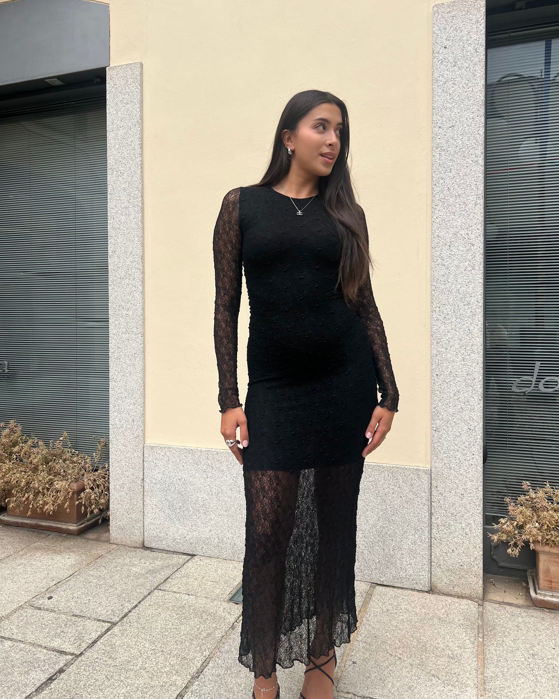 Abito elasticizzato interamente in pizzo con fodera interna a tubino