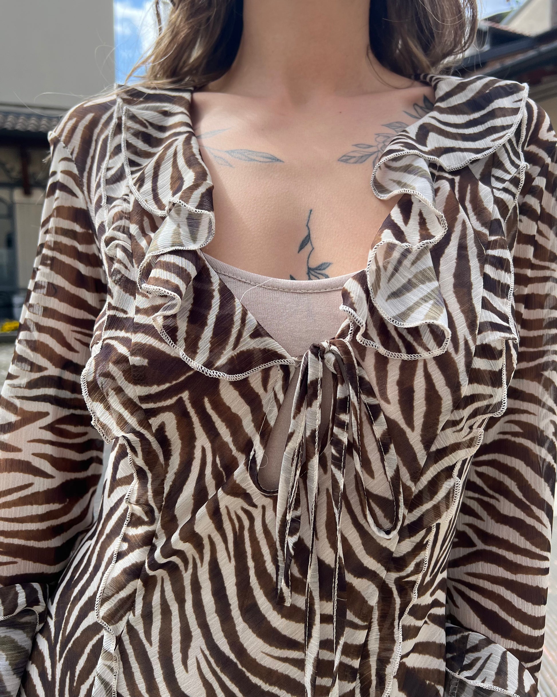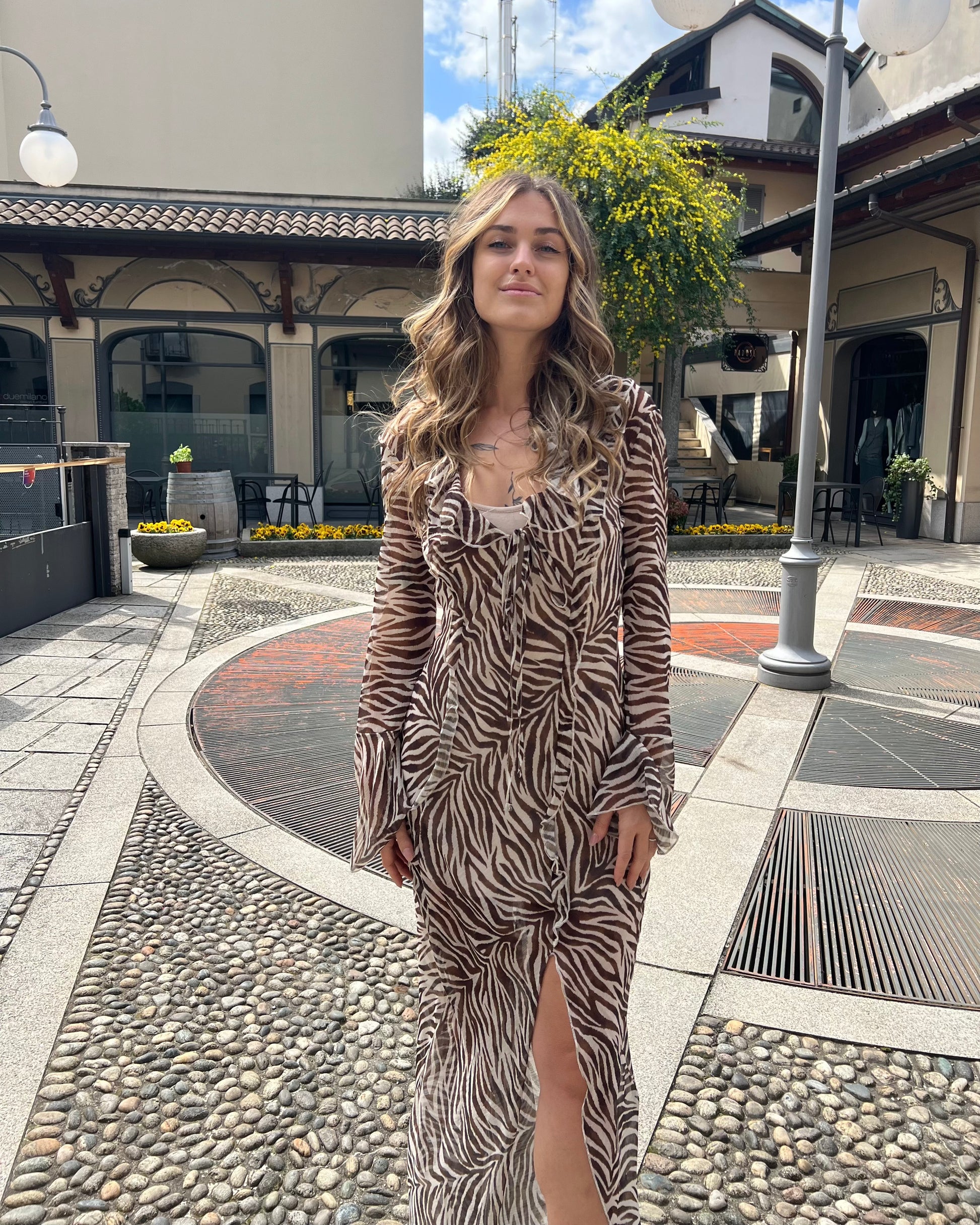 Abito a maniche lughe con spacco laterale, chiusura a cordino e dettagli sbuffo sullo scollo