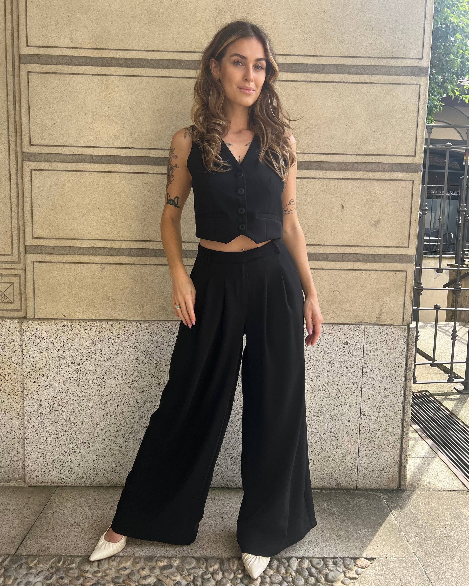 Set composto da gilet corto con scollo a v e pantalone morbido a palazzo con tasche frontali