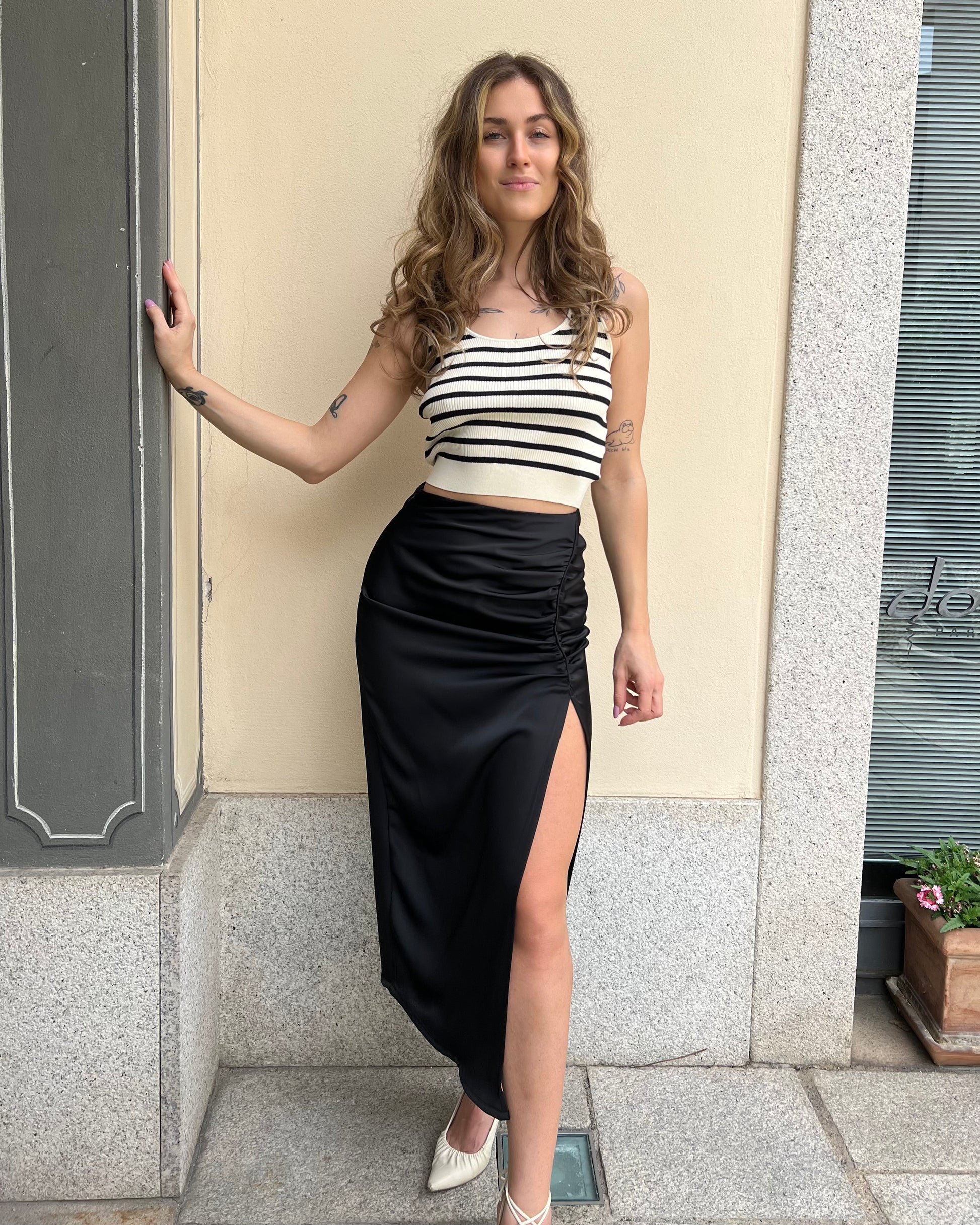 Gonna midi in satin a vita alta con spacco laterale e arricciatura in vita, chiusura a zip laterale