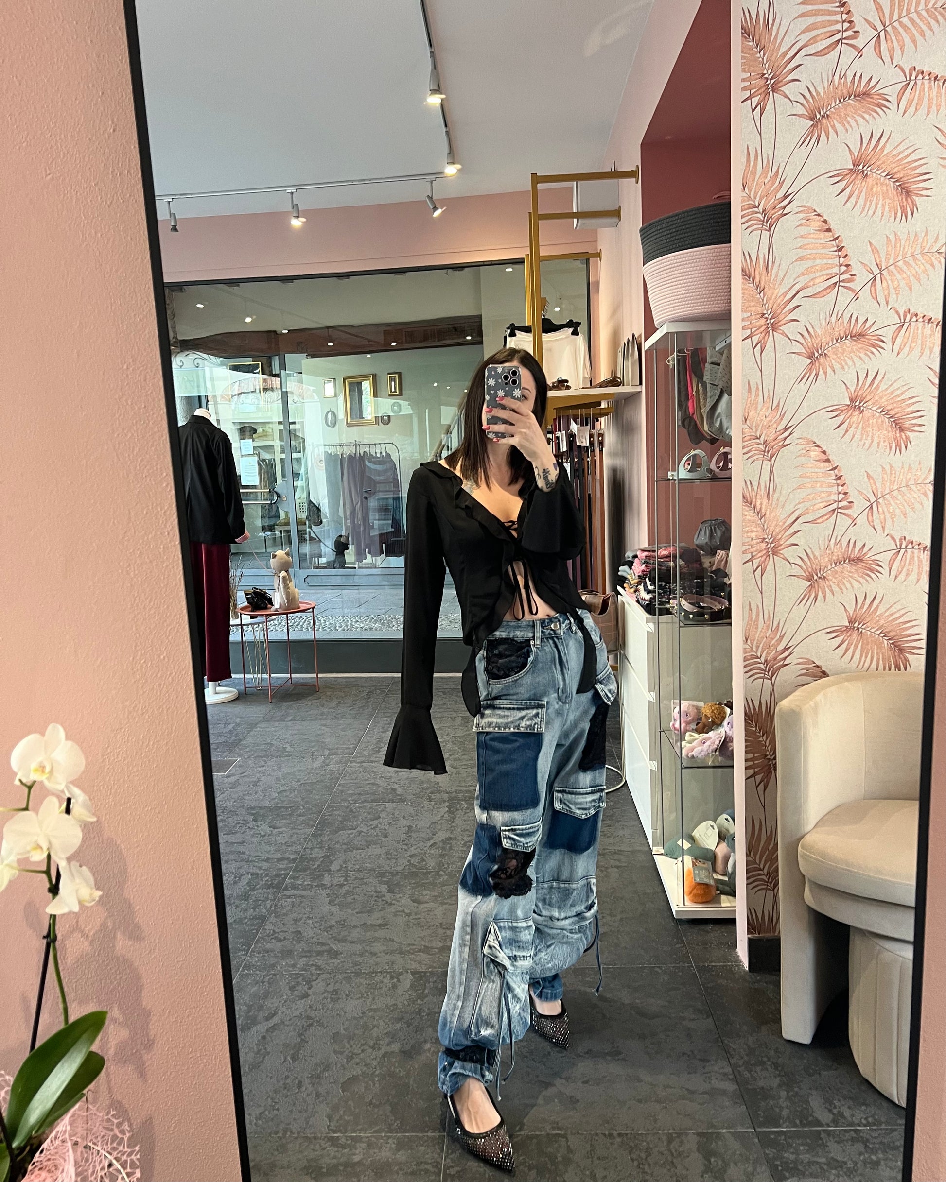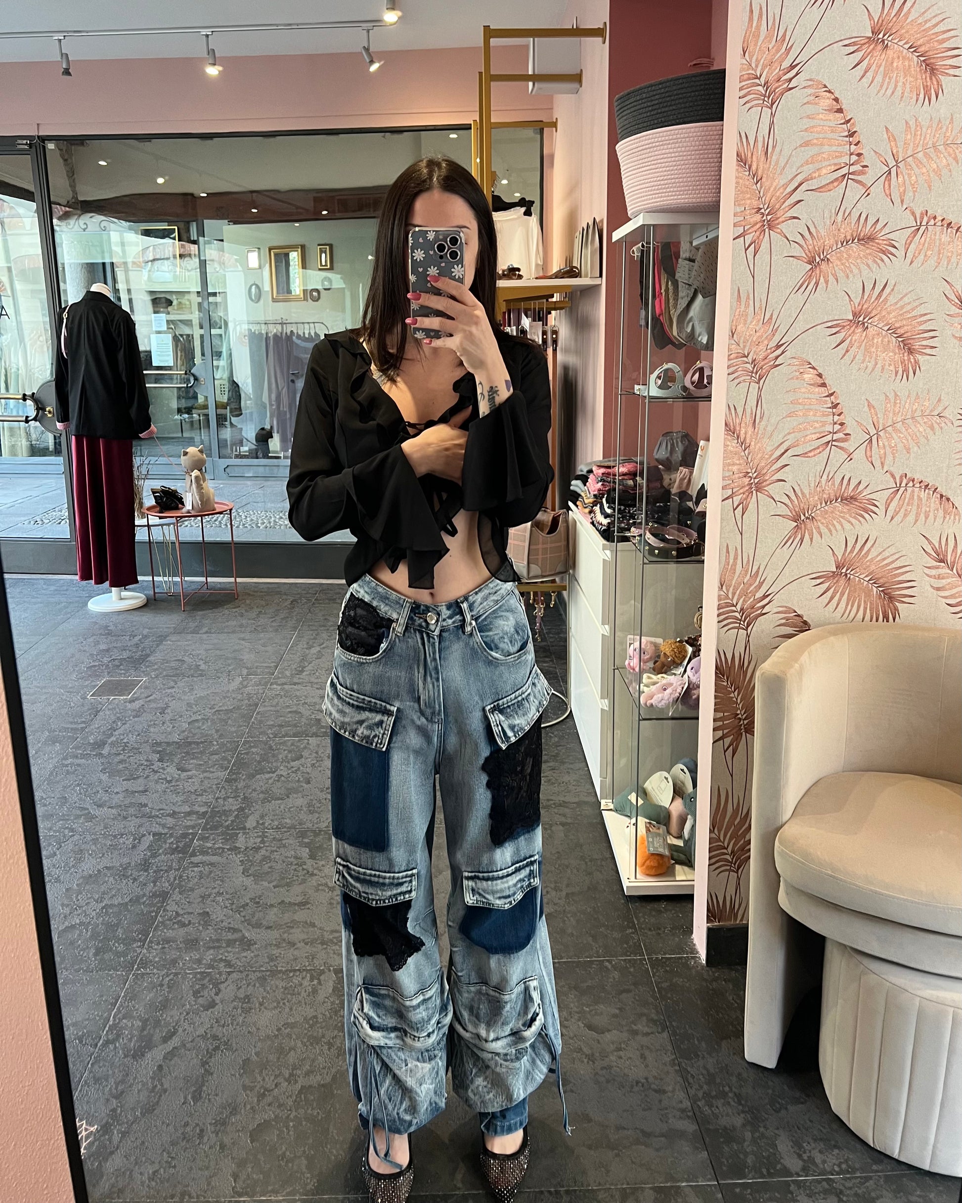 Jeans cargo con inserti in pizzo e chiusura regolabile alla caviglia
