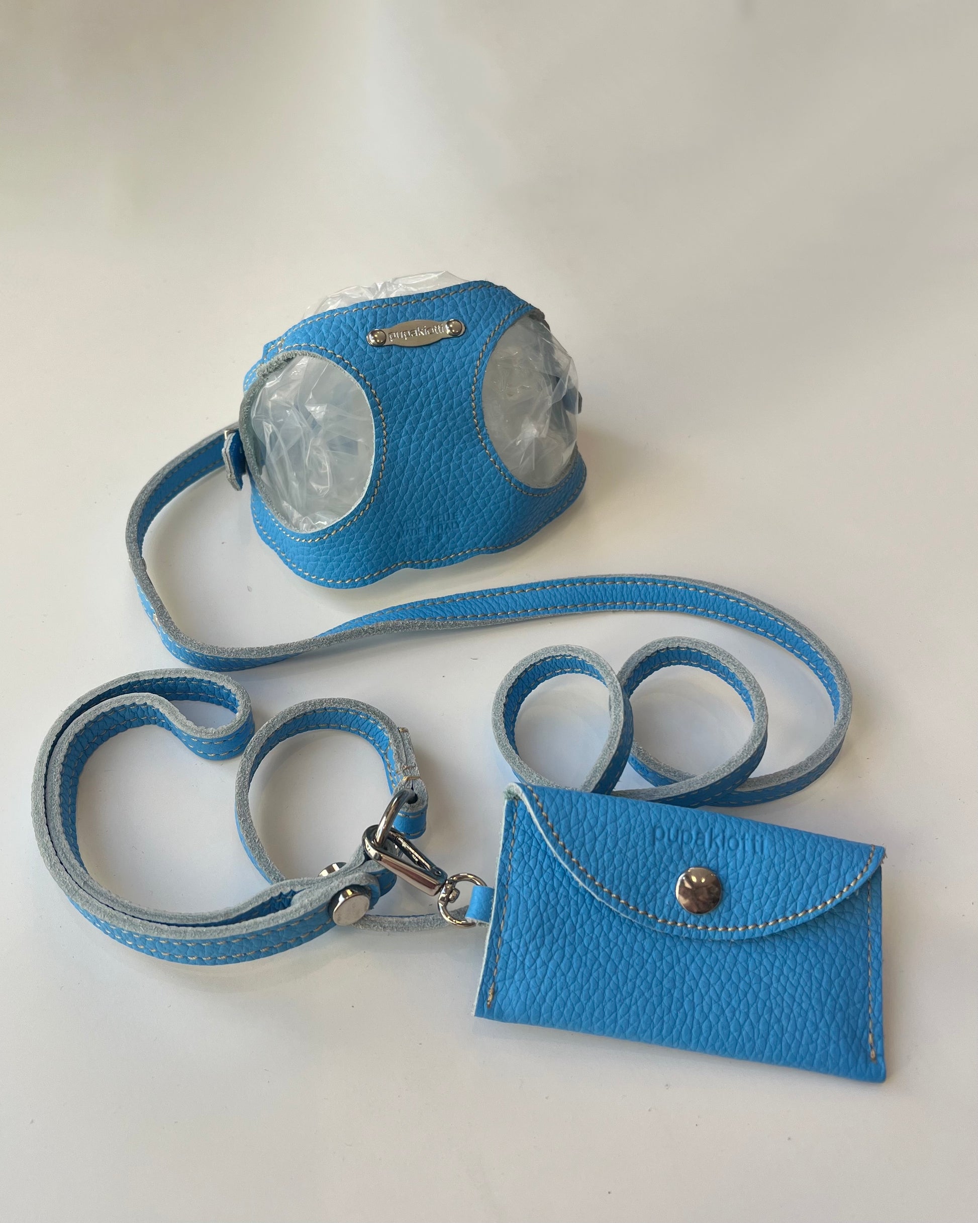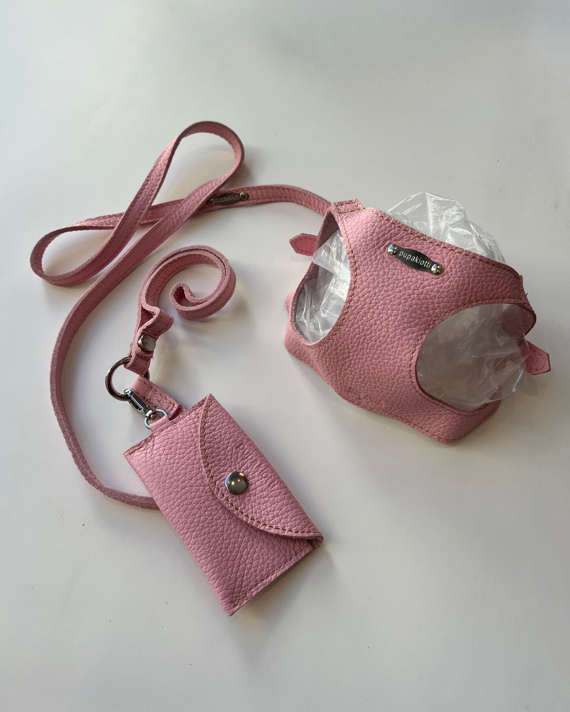 Set composto da pettorina con doppia chiusura a fibbia regolabile a presa completa sul petto, guinzaglio e portasacchetti in 100% pelle martellata