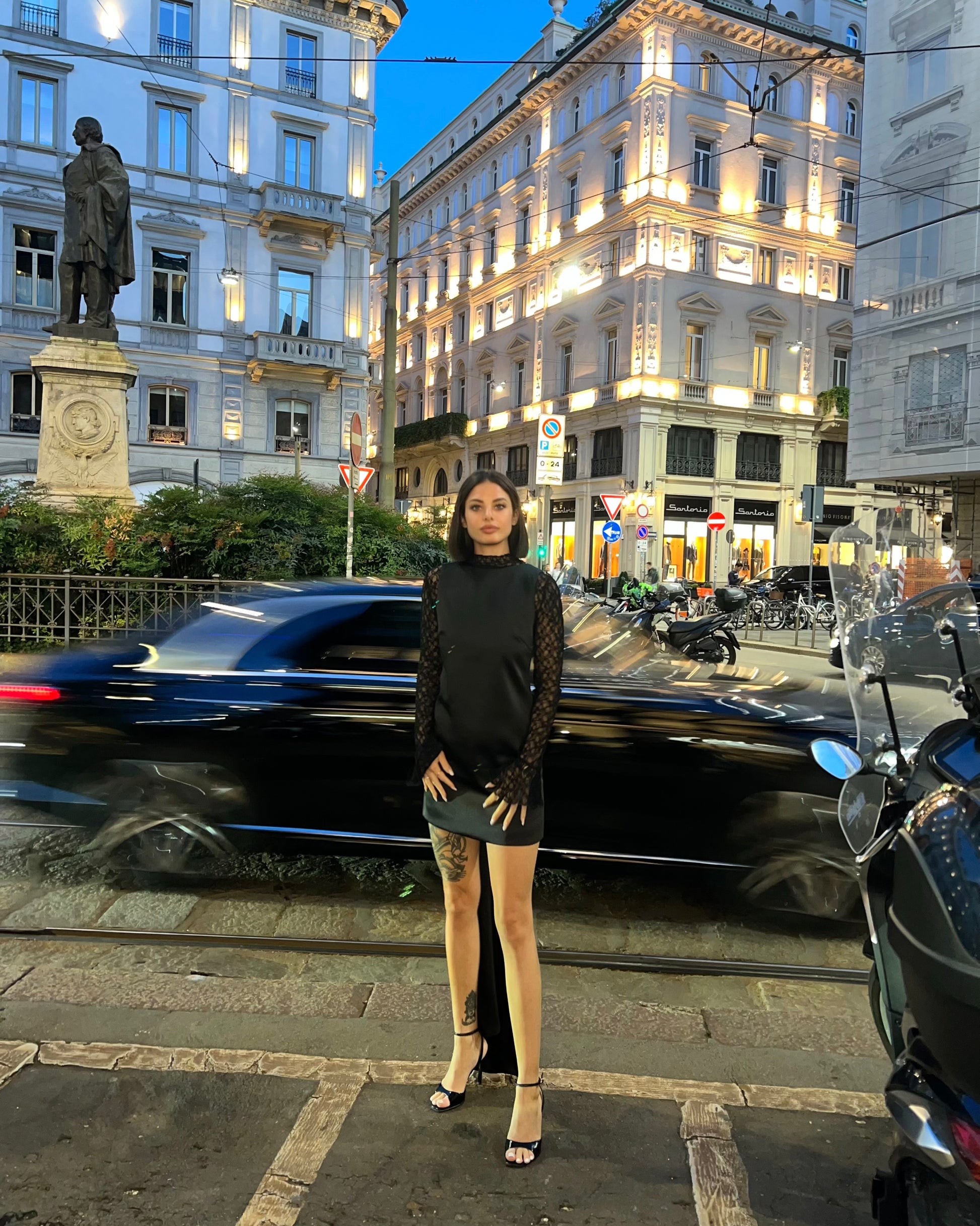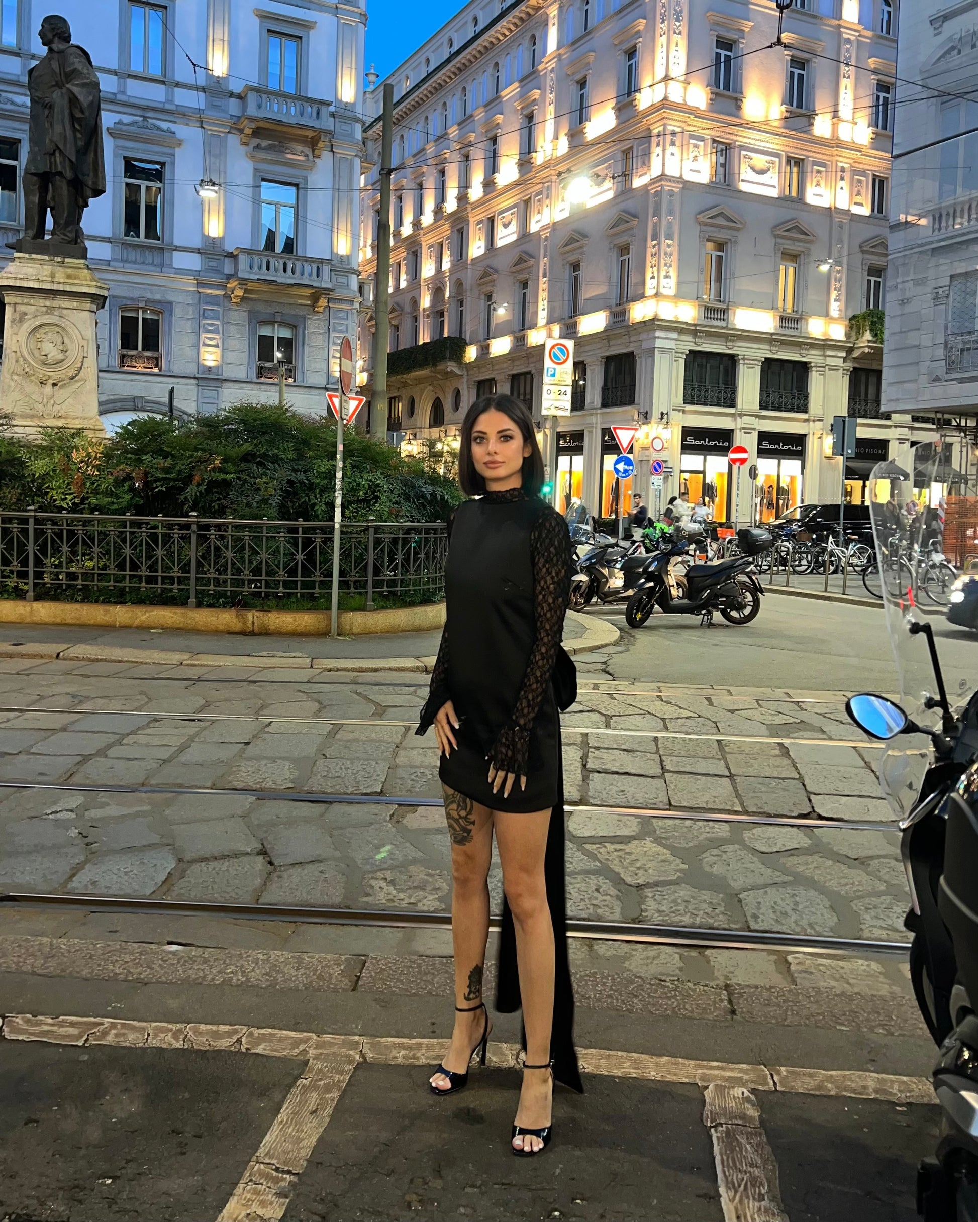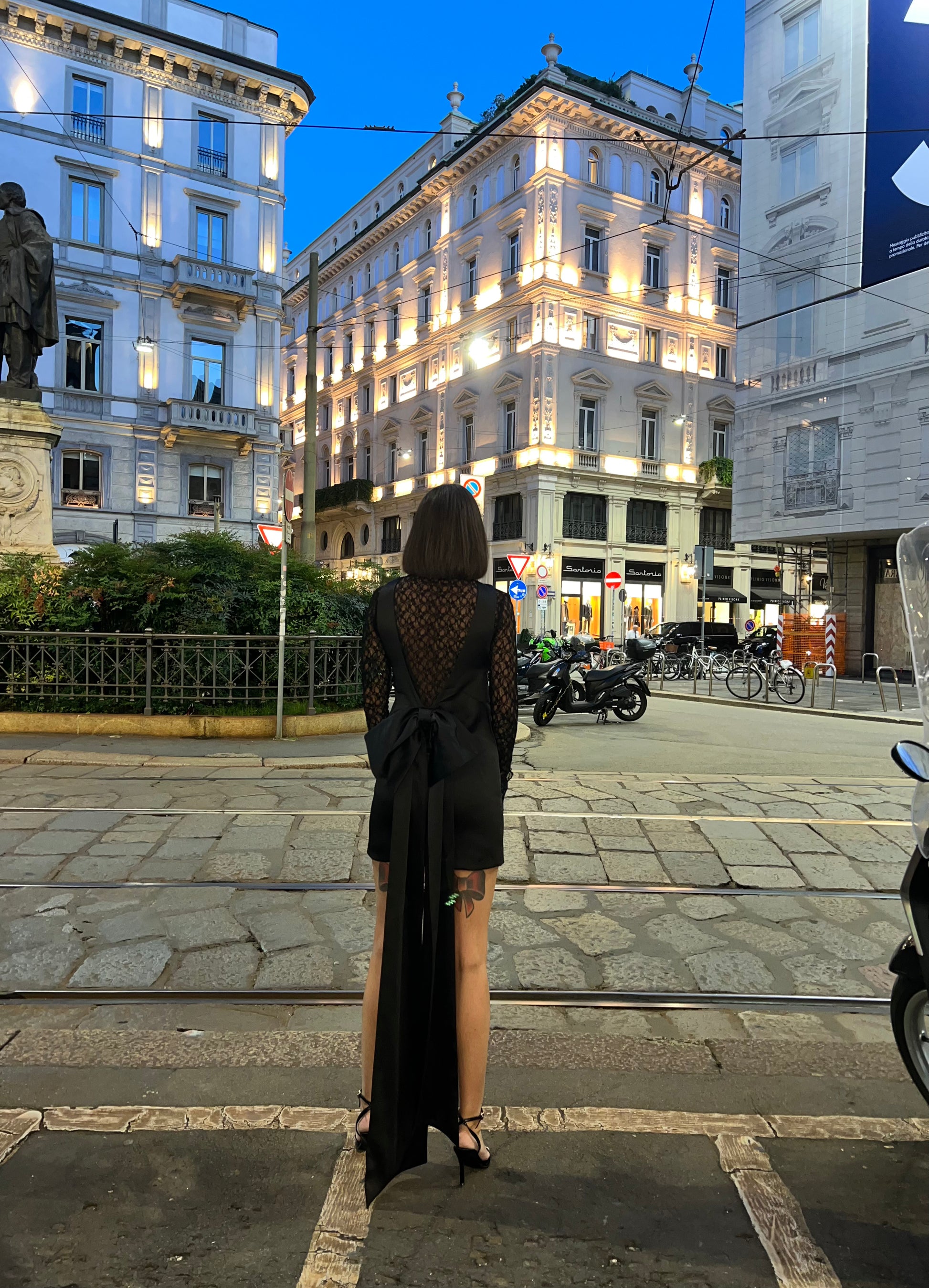 Tubino in raso nero con profondo scollo sulla schiena e dettaglio maxi fiocco con lunghe code